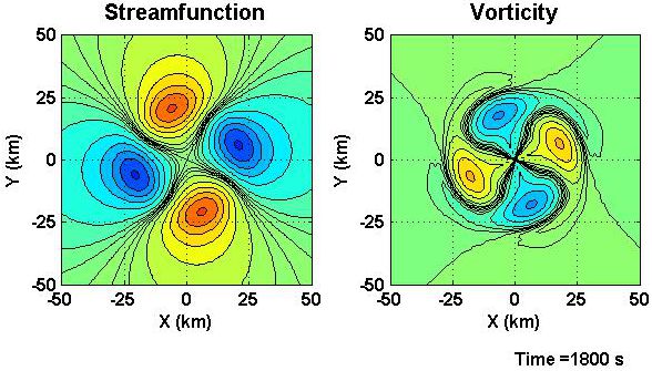 Fig 5a. Fields of WN-2 streamfunction (left) and vorticity (right), 1800 s after the forcing began. The streamfunction is organized into elliptical gyres and the vorticity is dominated by droplet-shaped gyres centered on the forcing with triangualar evanescent tails that extend inward from the cutoff radius and somewhat filamented sprials near the critical radius.