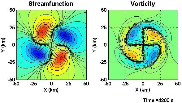 Fig. 5c Fields of WN-2 streamfunction (left) and vorticity (right), 4200 s after the forcing began. The forcing is much weaker, but not yet zero. Both streamfunction and vorticity amplitudes are decreasing. Vorticity is becoming more filamented and the inner evanescent tails are less prominent.